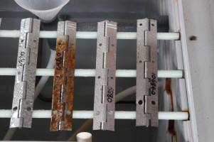 1 Hour into the salt spray test the plain steel hinge was already rusting
